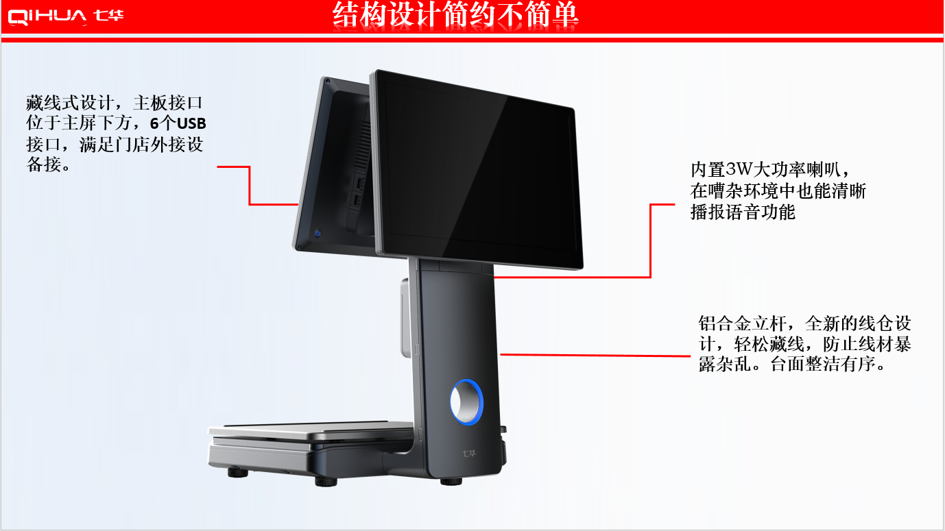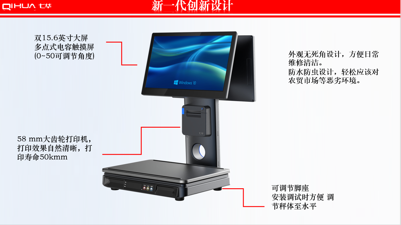 描述:新一代創(chuàng)新設(shè)計(jì),雙15.6英寸大屏,多點(diǎn)式電容觸摸屏可(0~50可調(diào)節(jié)角度)。鋁合金立桿,全新的線倉(cāng)設(shè)計(jì),輕松藏線,防止線材暴露雜亂。臺(tái)面整潔有序。七華自研稱重專利技術(shù),稱重穩(wěn)定、快速;過(guò)載保護(hù)設(shè)計(jì),設(shè)強(qiáng)度稱重頻率下也能保持穩(wěn)定準(zhǔn)確;通過(guò)國(guó)家計(jì)量認(rèn)證, 支持國(guó)內(nèi)各地區(qū)檢驗(yàn)要求。外觀無(wú)死角設(shè)計(jì),方便日常維修清潔。 防水防蟲(chóng)設(shè)計(jì),輕松應(yīng)該對(duì)農(nóng)貿(mào)市場(chǎng)等惡劣環(huán)境。